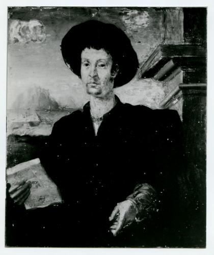 - NOTIZIE STORICO CRITICHE La fotografia riproduce il Ritratto di giovane con un cartiglio, attribuito all'Amico Friulano del Dosso e passato in asta da Christie's (Londra, 17 febbraio 1978), prima del restauro del 1978. Antonio Morassi lo assegnava a un generico Maestro napoletano, come si evince da nota manoscritta apposta sul supporto di un altro esemplare della fotografia (C.XI, inv. C.1665). La fotografia fa parte dell'insieme archivistico denominato "Collezione Züst" (due cartelle: C. XI e C. XII), nello specifico, è conservata all'interno della cartella C. XI, nella sottocartella "Doppi e scarti". Trattasi del frutto dello studio condotto da Antonio Morassi sulla collezione di Giovanni Züst nel 1957.