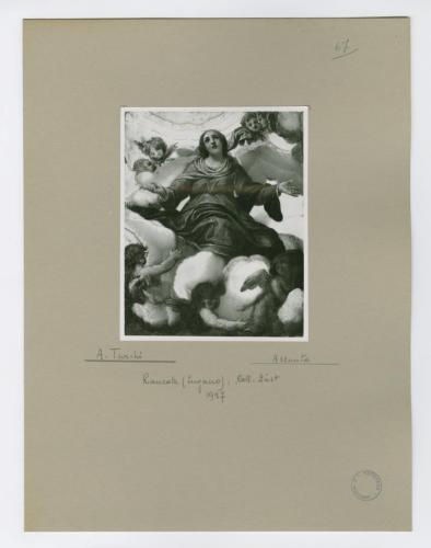 - NOTIZIE STORICO CRITICHE La fotografia, che riproduce l'Assunta attribuita ad Alessandro Turchi detto l'Orbetto (1578-1649) da Antonio Morassi, ma oggi ricondotta alla Scuola lombarda e ritenuta forse l'elemento di un tabernacolo (Valle Parri 2019, p. 58), fa parte dell'insieme archivistico denominato "Collezione Züst" (due cartelle: C. XI e C. XII), nello specifico, è conservata all'interno della cartella C. XII. Trattasi del frutto dello studio condotto da Antonio Morassi sulla collezione di Giovanni Züst nel 1957. La fotografia è montata su cartoncino.
