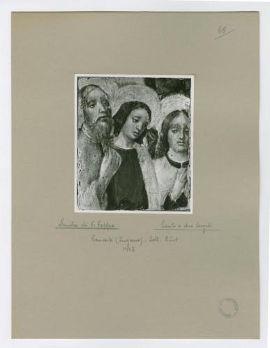 - NOTIZIE STORICO CRITICHE La fotografia riproduce i Tre santi dipinti su tavola attribuita da Morassi inizialmente a un seguace di Ambrogio da Fossano e in seguito alla cerchia di Vincenzo Foppa da Morassi, recentemente (2010) immessa nel mercato antiquario (Valle Parri 2019, p. 73). La fotografia, montata su cartoncino, fa parte dell'insieme archivistico denominato "Collezione Züst" (due cartelle: C. XI e C. XII), nello specifico, è conservata all'interno della cartella C. XII. Trattasi del frutto dello studio condotto da Antonio Morassi sulla collezione di Giovanni Züst nel 1957.