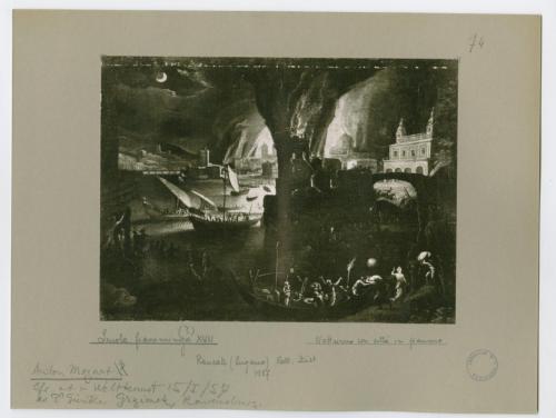 - NOTIZIE STORICO CRITICHE La fotografia riproduce un notturno, opera di scuola fiamminga del Seicento, passato in asta da Christie's (Londra, 17 febbraio 1978) con attribuzione a Jan I Grevenbroeck (Johann o Giovanni Grevenbroeck), detto il Solfarolo, nonno del celebre Jan II van Grevenbroeck (Giovanni Grevembroch, 1731-1807), mentre una nota di Antonio Morassi sul supporto secondario suggerisce il nome del pittore Anton Mozart (1573-1625). La fotografia fa parte dell'insieme archivistico denominato "Collezione Züst" (due cartelle: C. XI e C. XII), nello specifico, è conservata all'interno della cartella C. XII. Trattasi del frutto dello studio condotto da Antonio Morassi sulla collezione di Giovanni Züst nel 1957. La fotografia è montata su cartoncino.