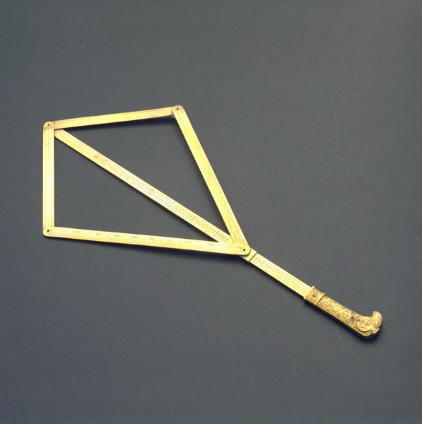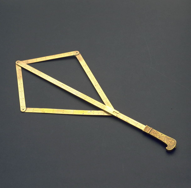 Il radio latino (così chiamato perché ideato da Latino Orsini) veniva utilizzato, mediante operazioni di traguardo, per misurare le distanze, le altezze e le profondità. A tal fine, è dotato di quattro regoli snodati che formano un quadrilatero simmetrico rispetto a una diagonale, una cui estremità scorre lungo un'asta centrale. Sui regoli sono tracciate varie scale di misura, come il quadrato delle ombre (segnato "VMBRA VERSA - VMBRA MEDIA - VMBRA RECTA") e la scala dei gradi. Mancano, nei punti di snodo, le mire per traguardare. Lungo il bordo esterno dell'asta centrale si trova una graduazione e indicata con "FIGVRE RETTILINEE EQVILATERE". Sull'asta centrale sono tracciate le seguenti lettere e segni appaiati: "O - S"; "A - +"; "G - P"; "M - [freccetta]". Lo strumento è dotato di manico ricurvo di ottone dorato e elegantemente cesellato nel quale è inserita una piccola bussola, completa di vetro e di ago magnetico, munita di coperchietto con un leone sbalzato. Il leone impugna una spada con una zampa e con l'altra schiaccia un animale (serpente o rapace?). Sul verso del manico è inciso uno stemma a forma di scudo con un'aquila ad ali aperte posata sull'elsa di una spada.